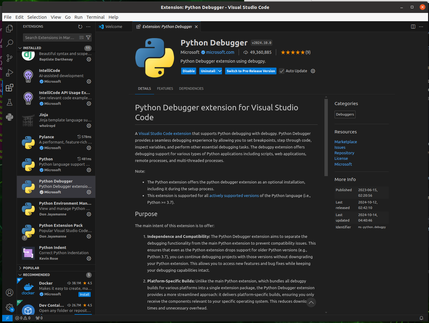 Open the VSCode in lunch pad, and click the extension button (icon with blocks) on the left side bar, then search for following python extensions (Installed Section, Python related only):