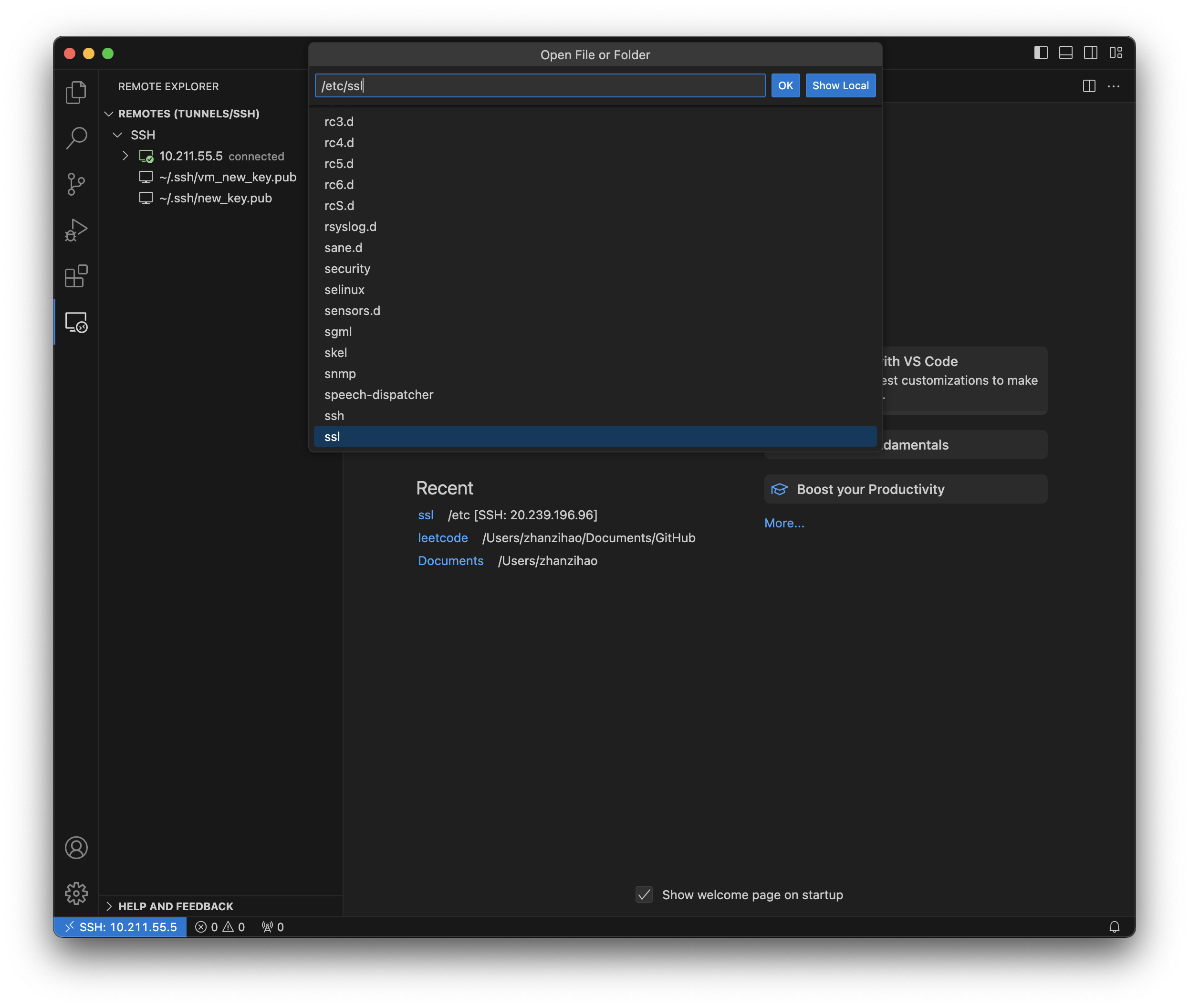 Now you can see a File directory system is shown on the left sidebar, so you can simply drag your key/pem files into the ssl directory. That's reason why I choose VSCode to connect our VM, it is simple and readable.