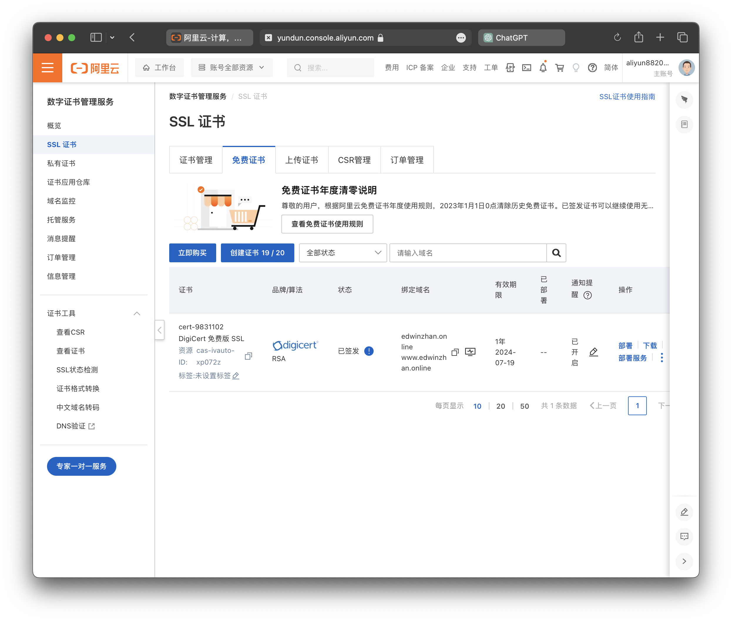 Similar to a domain name, you need an SSL Certificate from sellers, and you need a management station to handle it. An SSL Certificate should be bound to your domain name.